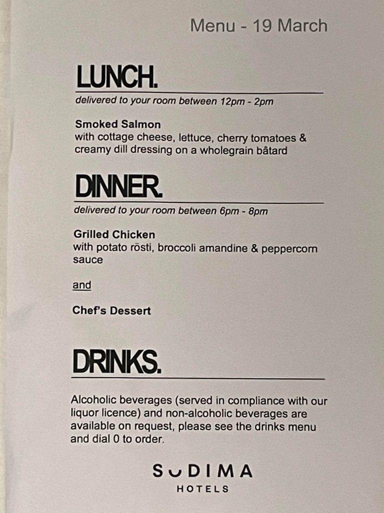 I gave myself a sleep-in this morning and woke up 5 minutes before breakfast was delivered to the door at 7.20am. A solid eight hours sleep. Breakfast is a ham, cheese and lettuce croissant (which I would have preferred to be warm but there isn’t a microwave here) and a very unusual fruit salad (maybe passionfruit) but I’ve not had anything like it before…it was ok. Morning tea consists of mandarins and apple juice.
