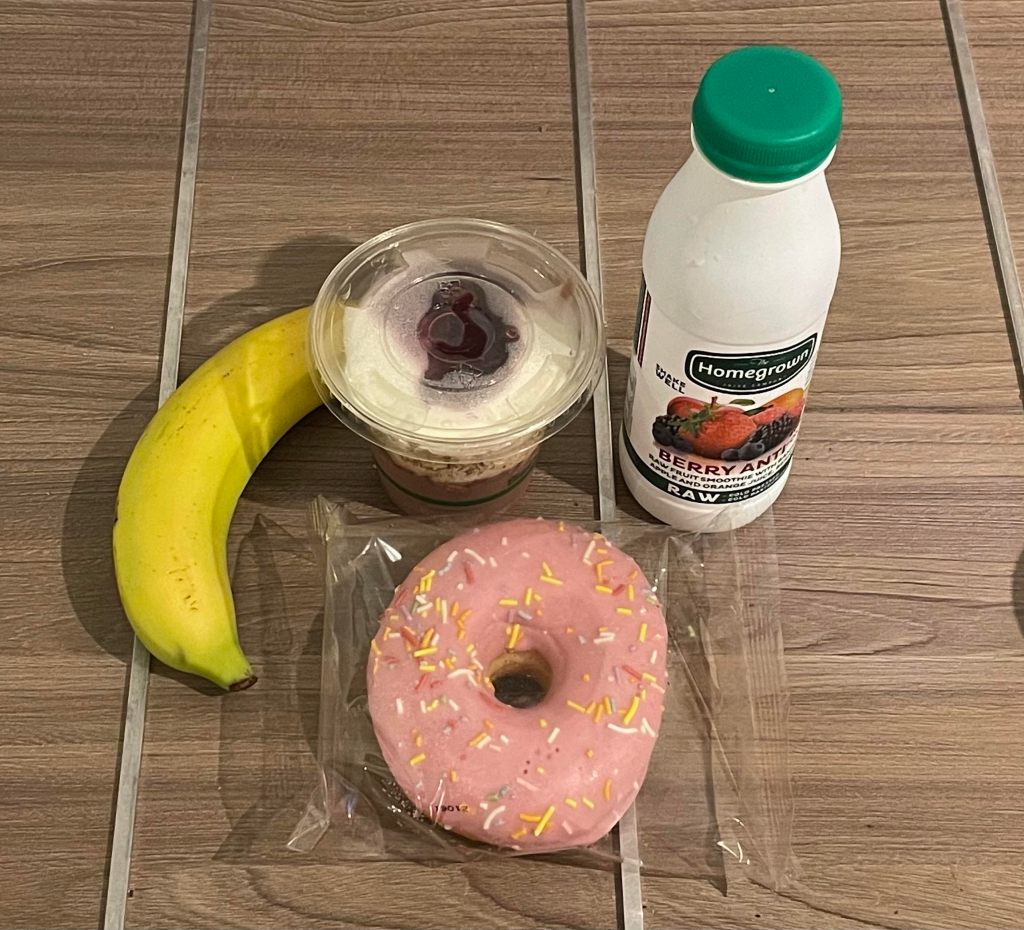 Breakfast is a muesli cup with yoghurt and boysenberry and a smoothie. Morning tea consists of a raspberry donut with sprinkles and a banana.