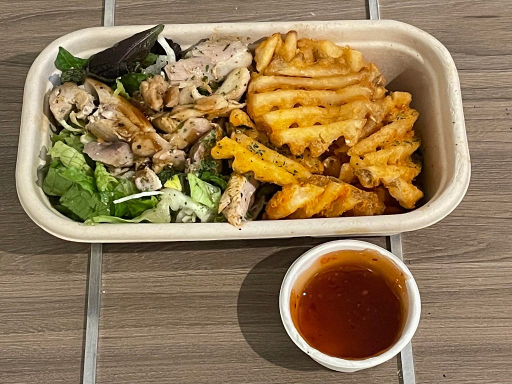 I’ve added milk to the muesli cup because it was otherwise a bit too dry for my liking. The menu for lunch and dinner is here too. I’m having an open grilled chicken sandwich and crosscut chips for lunch and dinner consists of chimichurri marinated fish and salad – sounds divine again.